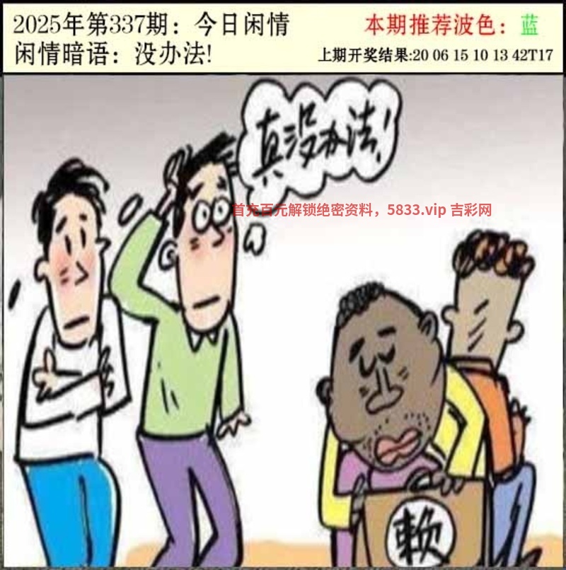 | 337期:今日闲情暗语:【没办法!】 解:图中是两个赖皮人蹲在地上,解凶丑生肖鼠牛虎猴狗猪 送:牛虎鼠羊鸡兔 |